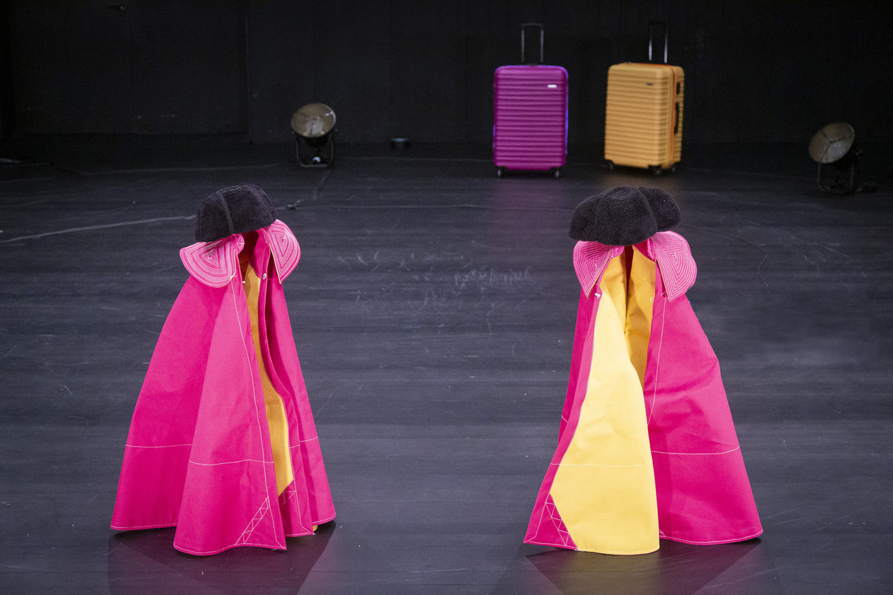 Marco Berrettini et Milena Keller habillées en toreras sur scène. Elles ne comptent pas répondre à toutes ces questions, puisqu’elles se les posent, comme nous. Elles cherchent, avec grâce, humour et intelligence, comment danser sur cette ligne de crête, envers et contre tout.
